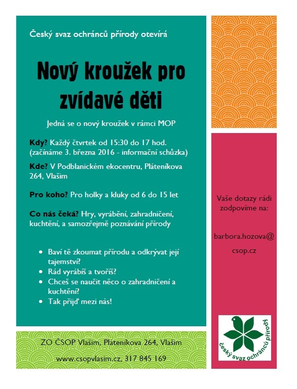 Vlašim. Český svaz ochránců přírody Vlašim otevírá nový kroužek pro zvídavé děti. Kroužek je určen pro děti od 6 do 12 let. Začínáme již 3. března 2016.