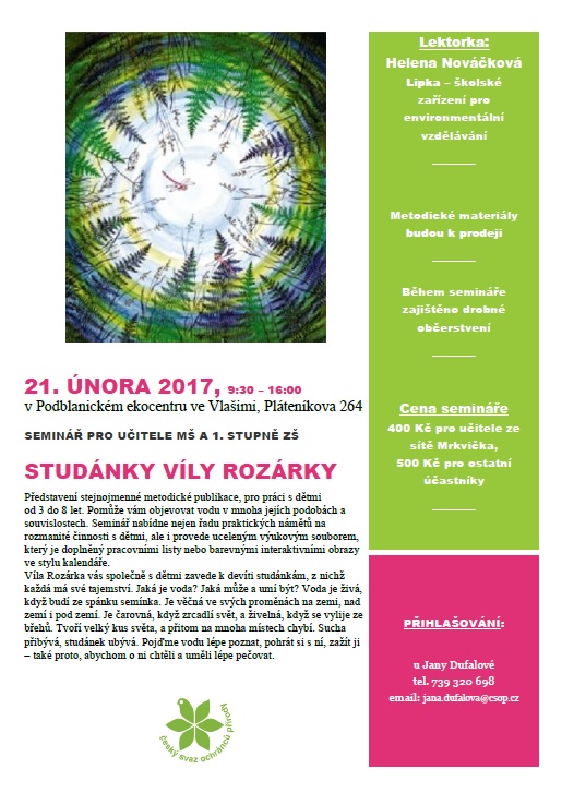 Seminář se uskuteční 21. února 2017 od 9:30 do cca 16 hodin v Podblanickém ekocentru. Představí metodickou publikaci Studánky víly Rozárky autorky Heleny Nováčkové s ilustracemi Jany Modré. Podíváme se na téma vody z různých úhlů pohledu, účastníci získají náměty pohybových, výtvarných, přírodovědných a jiných aktivit. Téma je zpracováno pro děti od 3 do 8 let. Metodika i s doplňkovými materiály bude na semináři k zakoupení.