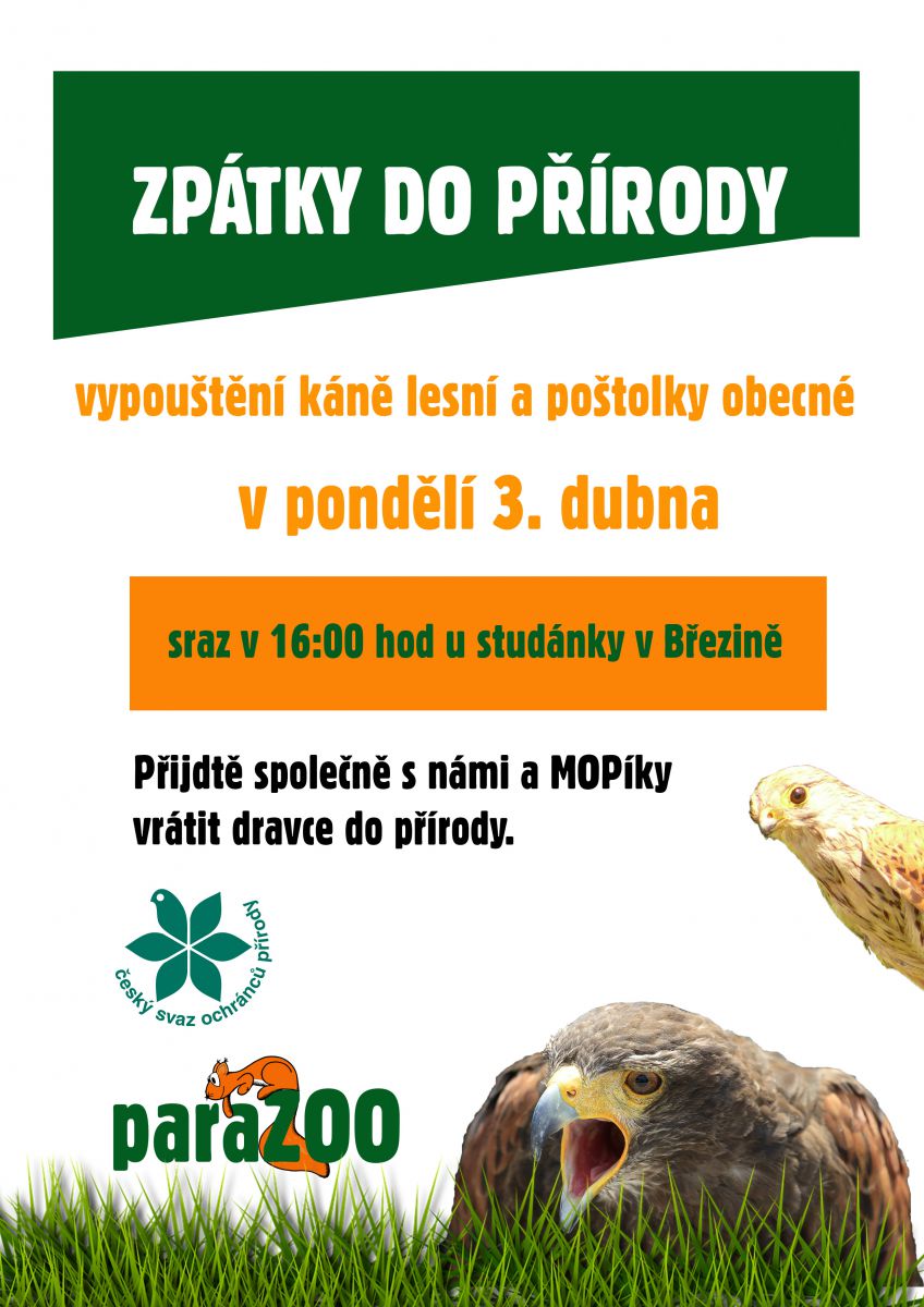 V pondělí 3. dubna od 16:00 hodin se můžete zúčastnit veřejného vypouštění káně lesní a poštolky obecné. Akce proběhne u studánky v Březině ve spolupráci s Mladými ochránci přírody.