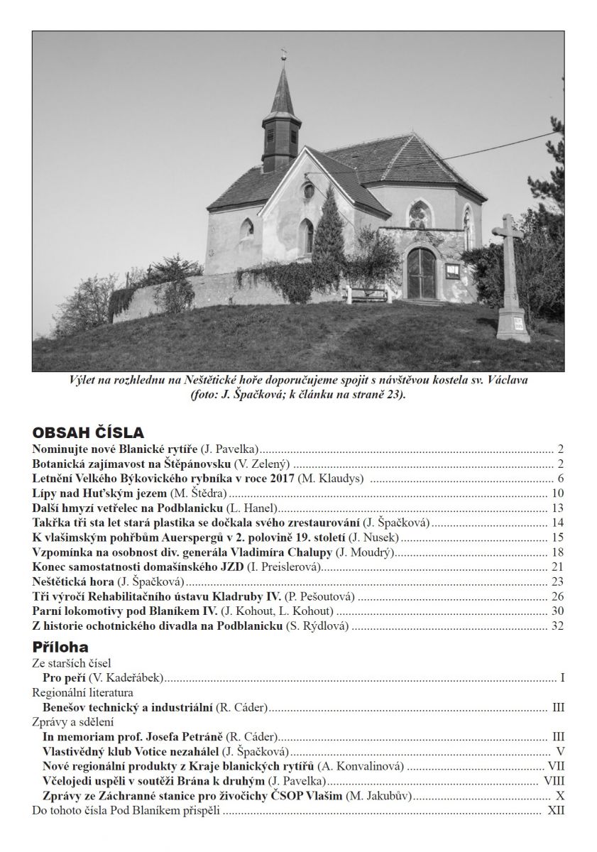 Časopis Pod Blaníkem č. 4/2017 připomene čtenářům možnost nominovat nové Blanické ryíře, poukáže na botanickou zajímavost na Štěpánovsku nebo upozorní na dalšího hmyzího vetřelce na Podblanicku. nehybí ani články věnované historii či pravidelné rubriky o památných stromech nebo o historii ochotnického divadla na Podblanicku.