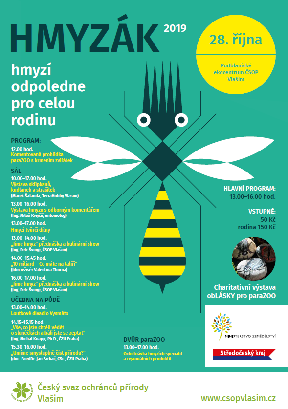Hlavní program Hmyzáku 2019 vypukne 28. 10. v 13:00 hodin. Jako každý rok i letos přijede malé i velké pobavit Aleš Bílek se svým loutkovým divadýlkem Vysmáto. Pro hmyzožravce jsou připraveny dvě přednášky na téma „Jíme hmyz“ a kulinární show a také ochutnávky hmyzích dobrot na slaný i sladký způsob. Entomology laiky i odborníky jistě zaujme přednáška pana docenta Farkače, který ve své přednášce představí hmyz jako nezbytný článek přírody a pan inženýr Knapp poodhalí tajemství ze života slunéček. Hmyzí zajímavosti představí také entomolog Ing. Miloš Krejčíř během ukázek ze své sbírky hmyzu.