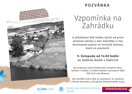 Zaniklá obec Zahrádka je neodmyslitelně spojena s vodní nádrží Švihov-Želivka. Dnes po ní na břehu přehrady zůstal jen opuštěný, přesto však významný kostel. „K přehradě se stále vrací lidé, kteří zde žili. Jim a všem, kdo se zajímají o historii, chceme nabídnout krátké podzimní zastavení a zamyšlení nad zaplacenou cenou za tento zdroj pitné vody – vodní nádrž Švihov,“ uvedla Veronika Dušková, lektorka návštěvnického střediska. Vernisáž výstavy začne ve 14:00 hodin a program naplní setkání s pamětníky a krátké hudební vystoupení žáků ZUŠ Zruč nad Sázavou. Nebude chybět ani drobné občerstvení.