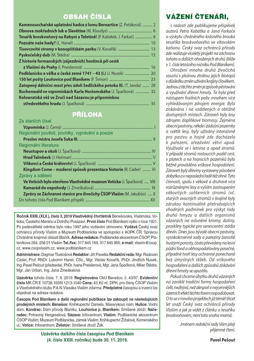 Předplatné časopisu a inzerci lze objednat na adrese Podblanické ekocentrum ČSOP, Pláteníkova 264, 258 01 Vlašim, tel.: 317 845 169, email: vlasim@csop.cz.