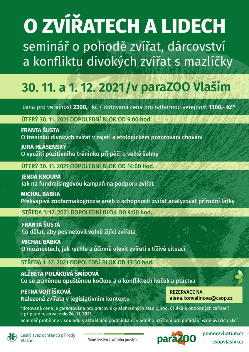 V úterý 30. listopadu a středu 1. prosince proběhne ve vlašimské paraZOO dvoudenní seminář pro pracovníky záchranných stanic, zoo, útulků a obdobných zařízení. Přednášející představí možnosti zvyšování pohody a odbourávání škodlivého stresu metodami operantního podmiňování a aplikací přírodních léčiv. Účastníci se dozvědí, jak získávat dárce a podporovatele a vytvořit fundraisingovou kampaň na získání financí na podporu chovaných či léčených zvířat. Seminář otevře téma konfliktu divokých zvířat s domácími mazlíčky a připomene správné postupy a aplikovatelnou legislativu. Díky tomu budou ošetřovatelé schopni nálezcům zvířat v nouzi sdělit jasný návod, na koho se obracet a kdo za zvíře přijímá zodpovědnosti.